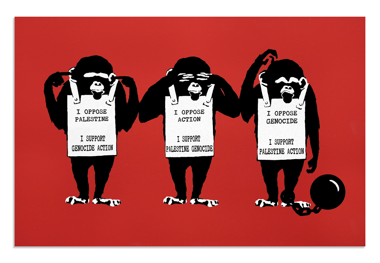 In this new print Not Banksy illustrate the maniacal motto of the Ministry of Peace*: turn a blind eye, proffer a deaf ear and silence anyone who causes a nuisance in the name of all common decency.